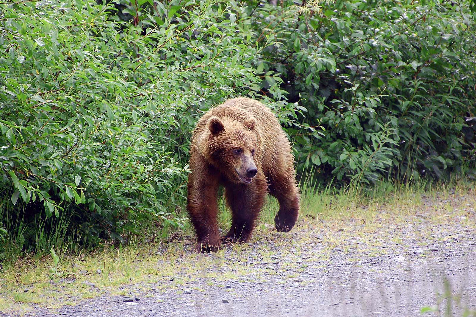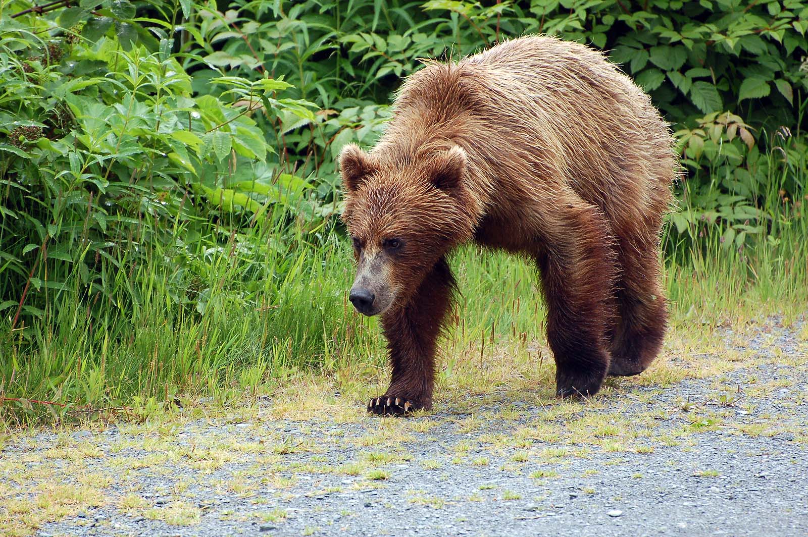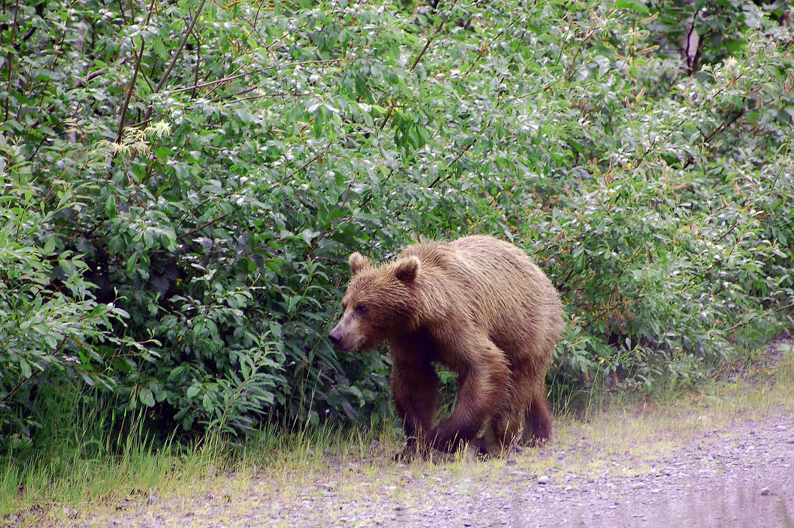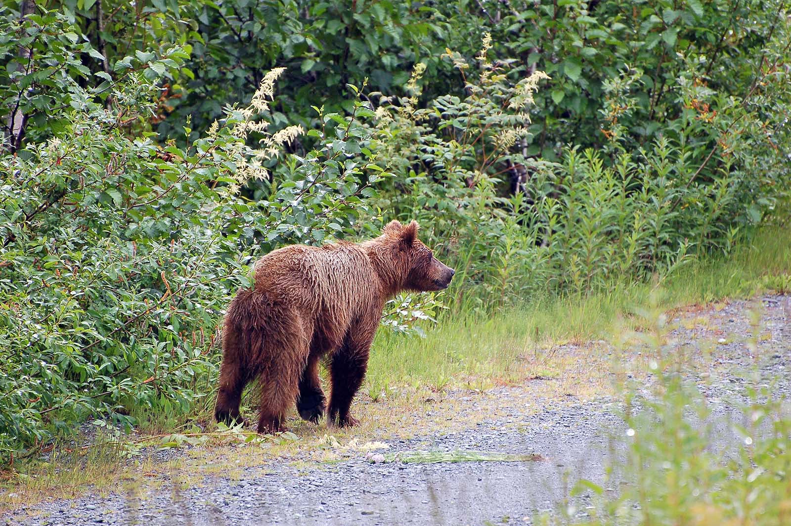 Braunbär! Ruhig wandert er hin und her. Was haben wir fotografiert! Durchs Fenster, vorsichtig die Tür aufgemacht. Ein Stück weiter standen Camper, die ihr Frühstück