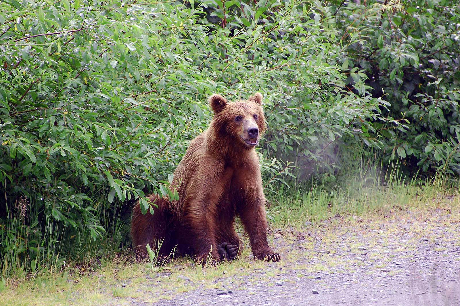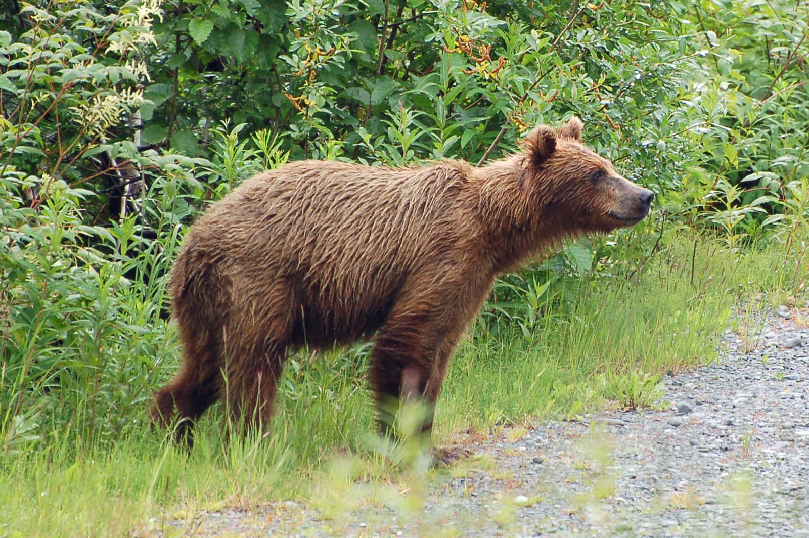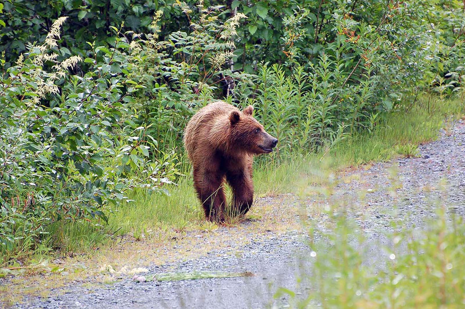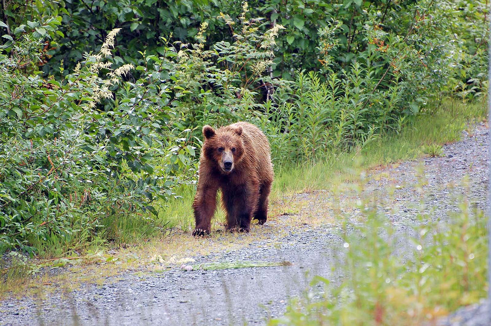 Braunbär! Ruhig wandert er hin und her. Was haben wir fotografiert! Durchs Fenster, vorsichtig die Tür aufgemacht. Ein Stück weiter standen Camper, die ihr Frühstück